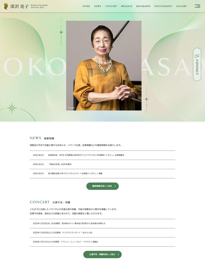 ピアニスト・深沢亮子様のコンサート情報や作品紹介、メディア掲載などを随時発信するオフィシャルサイトを制作いたしました。国内外での公演活動をはじめ、日本音楽コンクールの審査員を務めるなど、幅広く活動されています。
